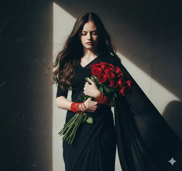Create a retro vintage grainy but bright image of the reference picture but draped in a perfect black colour. Pinterest aesthetic retro saree and red bangles. The girl is looking down standing against a solid wall deep shadows and contrast drama, creating a mysterious and artistic same face.