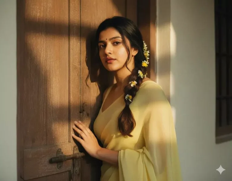 “prompt”: “A perfect plain chiffon saree pastel coral pink, dreamy Pinterest retro aesthetic. Hair open wavy with scarf tied loosely. Girl sitting by window, soft golden sunlight falling on face, lost in thought. Cinematic pastel grading with glowing highlights.”,