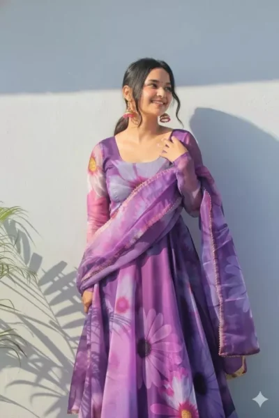 A vibrant, eye-level outdoor shot features a beautiful young Indian woman with dark hair tied back, posing confidently against a sunlit, textured white wall. She’s dressed in a stunning purple floral Anarkali suit with a long, flowing skirt and matching dupatta, both adorned with large, expressive flower patterns in various shades of purple, pink, and white. Her attire is complemented by ornate, dangling earrings. The sunlight creates interesting shadows on the wall to the left, and a hint of green foliage is visible at the bottom left. The woman’s expression is joyful and serene, with a slight smile and her gaze directed towards the upper right.